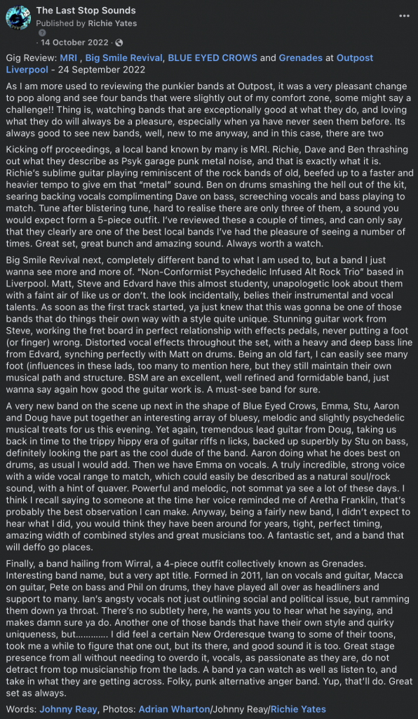 Gig Review: MRI at Outpost – 14 October 2022 Posted onAuthor Original Source Link: https://www.facebook.com/laststopsounds/posts/pfbid02pYiahEKKbJpaMAg3NJ6bJCrf9CSpqLYtwnNJo4Ha9VpF96Pqq2BR4GRC2jJAvrmwl?cft[0]=AZVLqdJwohxFpa5_BEUm4OqnhGQj-NyXB-lPUNRS7PEWHZ90zH7Sfb_eE0tfCVzSl57wwLw0xaBJ7IqgtT_XlHGzWrD5iX5s31ZmTKsKZfr–cGngxzc0UVqwbWOW-AxplrUPDf2YqbVgGIZqFgeGRoprBclZl9gI-8x4ZXsR1JJSke0-ejaStnWyBYBNfDJeeQ&tn=%2CO%2CP-R